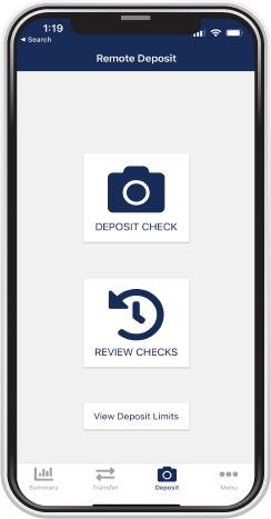 2. Open our mobile banking app. Click on the camera icon across the bottom panel that says “deposit”. Follow the prompts to take a picture of the front and back of the check.